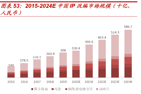 随着IP商业价值的逐渐上升,泡泡玛特进一步推动IP授权表现的机会,在视频游戏、电影及漫画等多方面授权合作,预计到2024年中国授权行业市场规模有望达1561亿元;中国IP改编娱乐市场规模将达5867亿元。