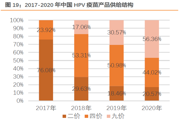 从国内市场上看,中国HPV疫苗产商相对较少;根据中检院批签发数据来看,九价HPV疫苗占比为36.59%,四价HPV疫苗和二价HPV疫苗占比分别为43.96%和16.66%。根据数据显示,从HPV疫苗产品结构来看,九价HPV疫苗占比不断上升,2020年占比达到了56.36%。