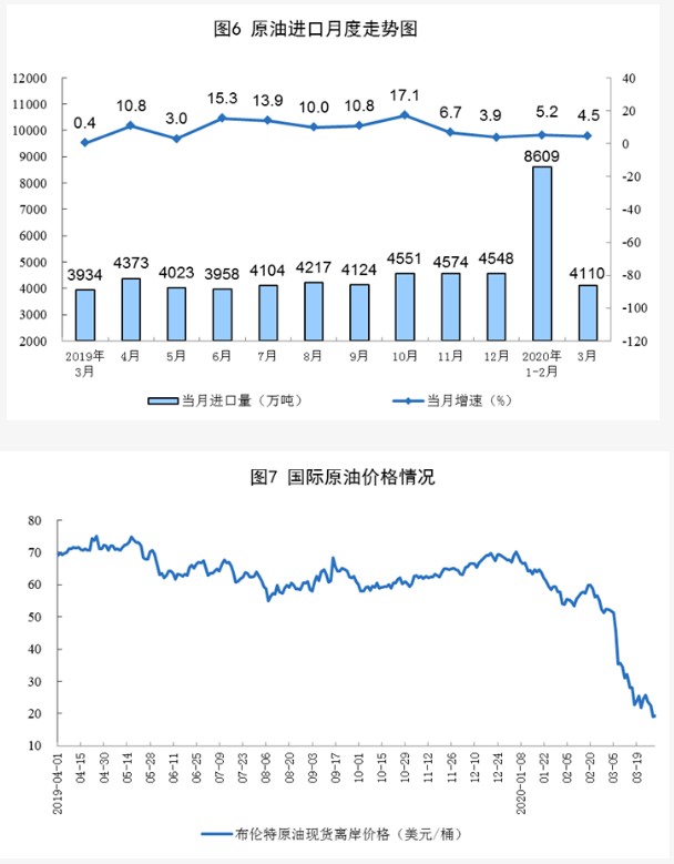 原油进口稳定增长,国际原油价格跌幅较深。3月份,进口原油4110万吨,同比增长4.5%。一季度,进口原油12719万吨,同比增长5.0%。3月31日布伦特原油现货离岸价格为19.19美元/桶,比2月28日的51.31美元/桶下跌62.6%。