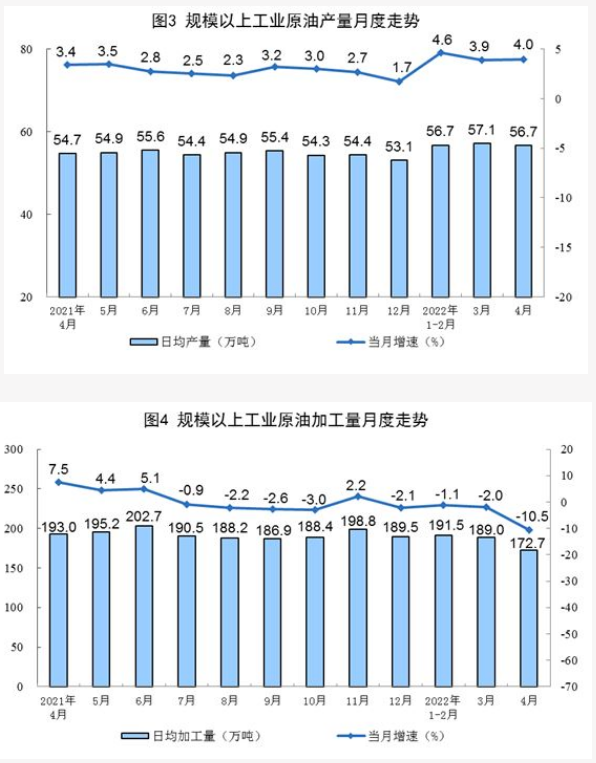 原油生产稳定增长,进口由降转增。4月份,生产原油1700万吨,同比增长4.0%,增速比上月加快0.1个百分点,日均产量56.7万吨。进口原油4303万吨,同比增长6.6%,上月为下降14.0%。