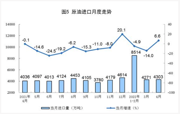 1—4月份,生产原油6819万吨,同比增长4.3%。进口原油17089万吨,同比下降4.8%。