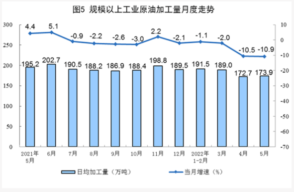 原油加工量继续下降。5月份,加工原油5392万吨,同比下降10.9%,降幅比上月扩大0.4个百分点,日均加工173.9万吨。1—5月份,加工原油27716万吨,同比下降5.3%。