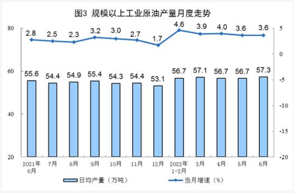 原油生产稳定增长,进口由升转降。6月份,生产原油1719万吨,同比增长3.6%,增速与上月持平,日均产量57.3万吨。进口原油3582万吨,同比下降10.7%,上月为增长11.9%。