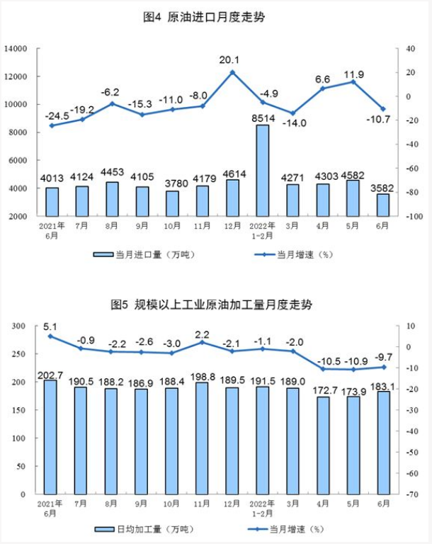 原油加工量降幅收窄。6月份,加工原油5494万吨,同比下降9.7%,降幅比上月收窄1.2个百分点,日均加工183.1万吨。1—6月份,加工原油33222万吨,同比下降6.0%。